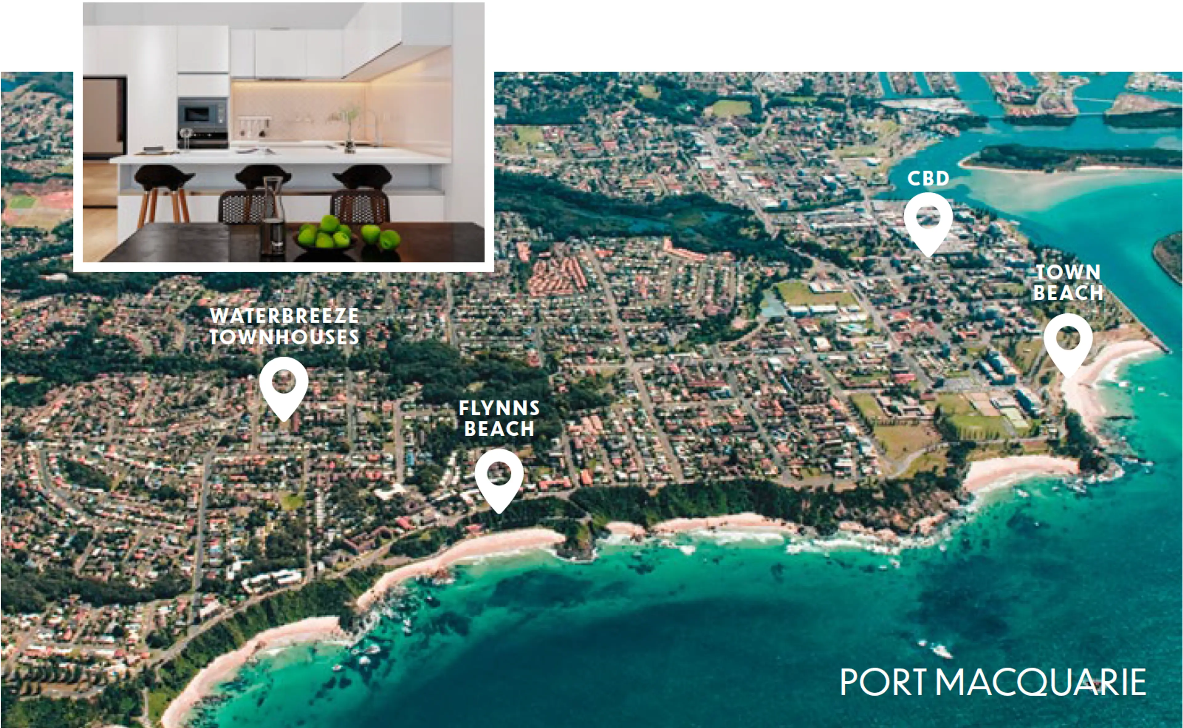 The Water Breeze 4 bedroom luxury townhouse is located in Port Macquarie on the Mid North Coast of NSW, boasting 17 pristine beaches, a lush hinterland, a diverse variety of attractions including the Koala Hospital, Billabong Zoo, river cruises, and a choice of beautiful bars restaurants and cafes. Blessed with an idyllic climate and stunning beaches, Architecturally designed to allow maximisation of natural light and Sea Breeze